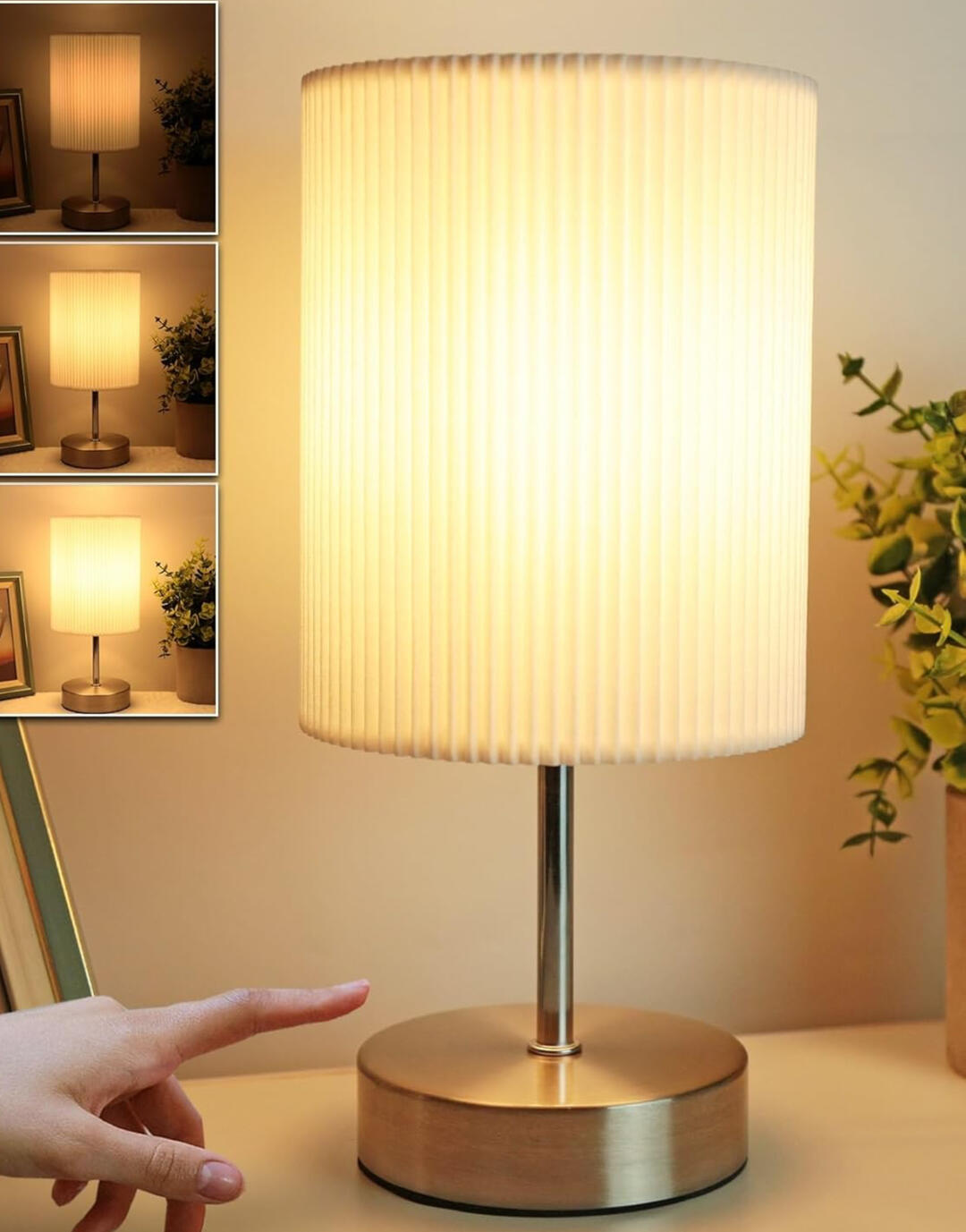 A traditional-inspired lamp with a soft pleated shade and a gentle touch dimmer that suits hallways, bedrooms and living rooms in period homes.