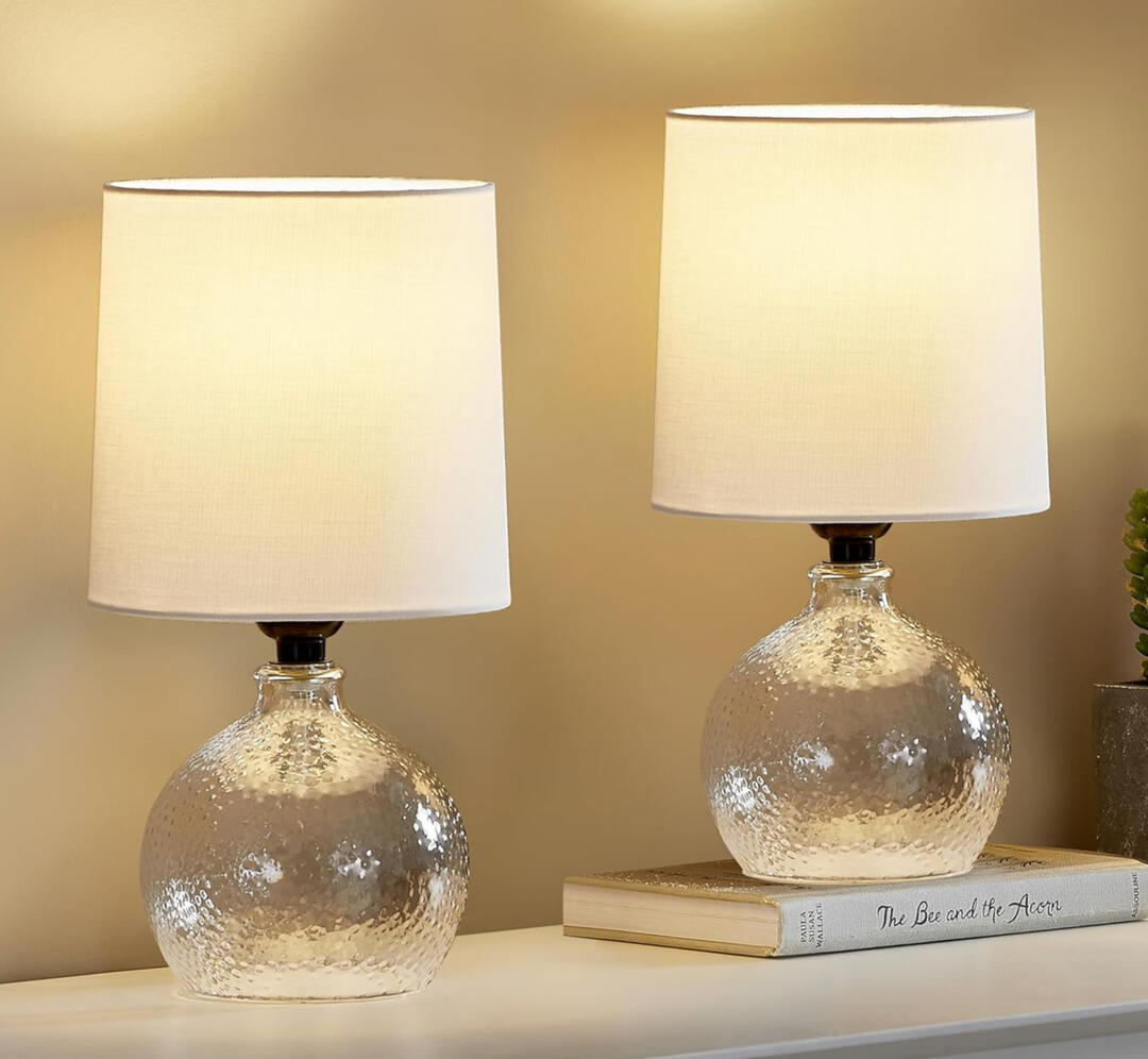 A clear glass table lamp that works particularly well in pairs, providing symmetry on consoles or bedside tables