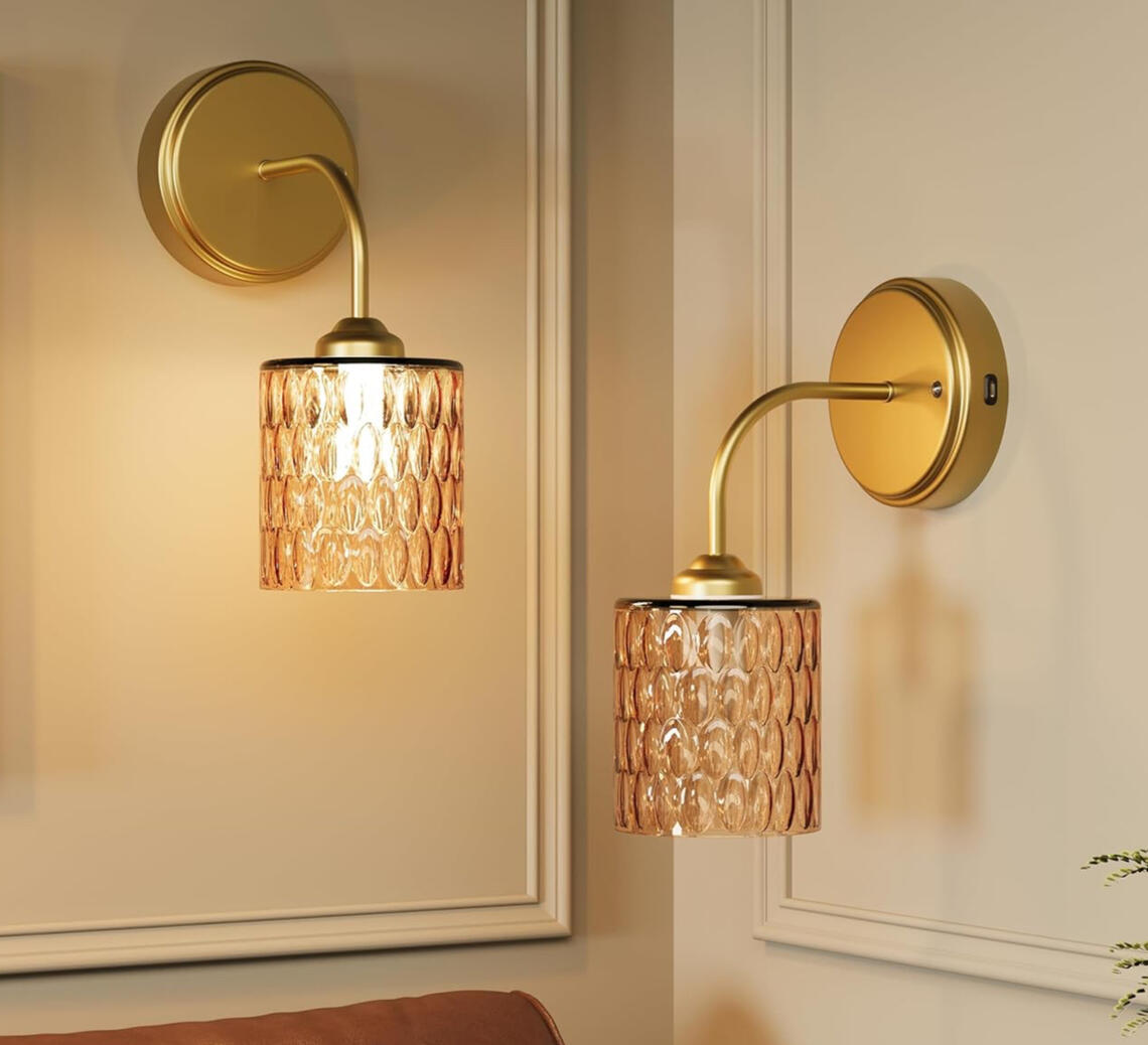 Warm amber glass wall lights, perfect for adding a touch of class to a cosy reading corner in a period home