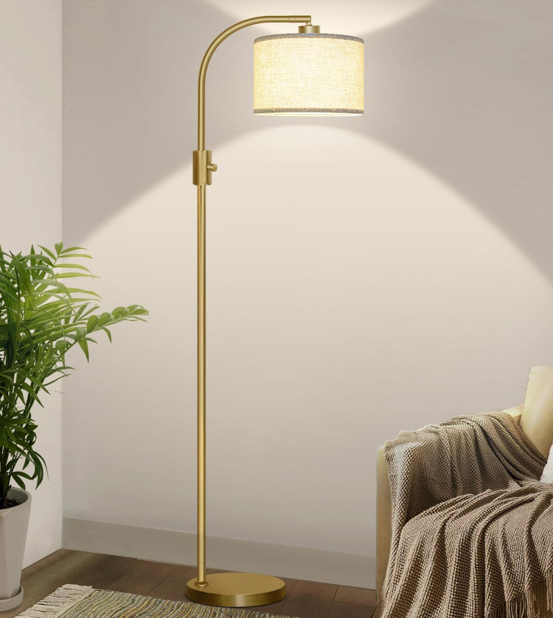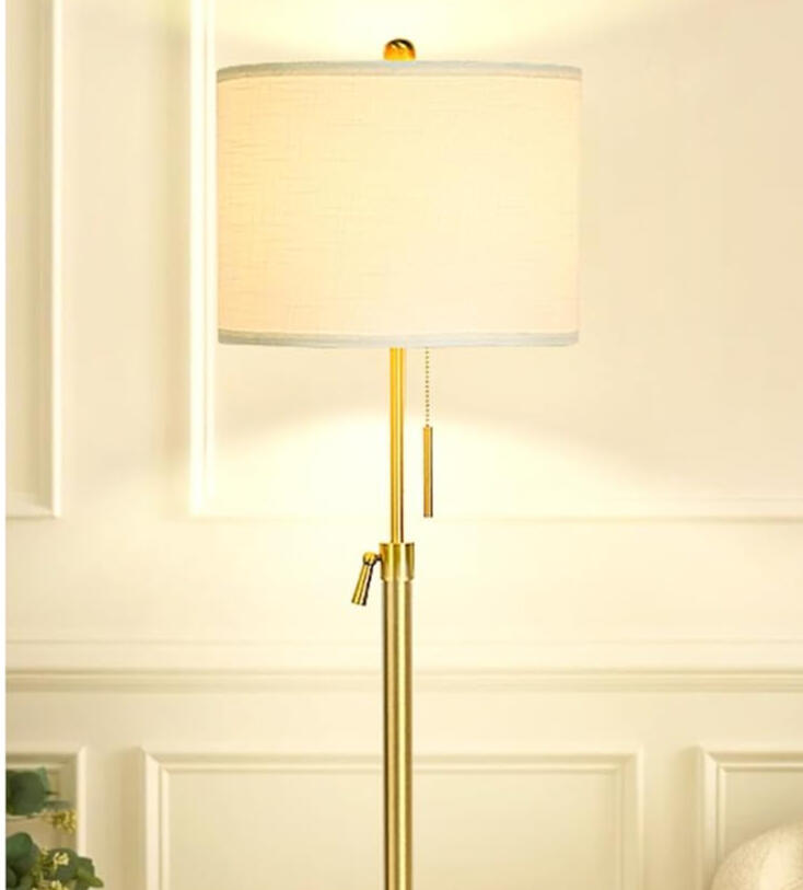 A simple gold and cream floor lamp with a simple style that works particularly well in a living room next to an easy chair