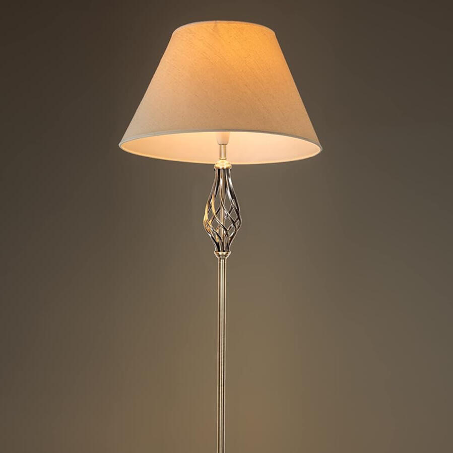 A traditional floor lamp with elegantly twisted stand and warm glow, perfect for a relaxing space in a period home