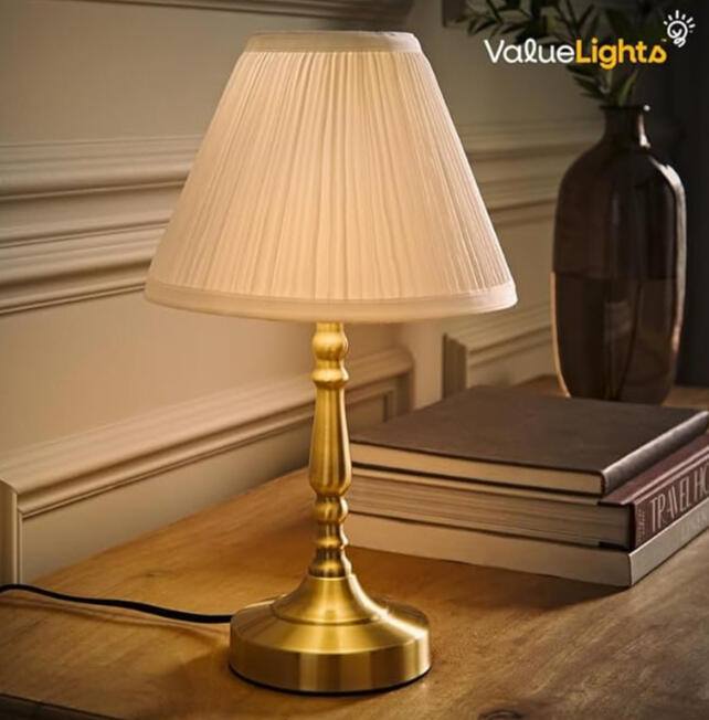 A traditional-inspired lamp with a soft cream pleated shade and a gentle touch dimmer that suits hallways, bedrooms and living rooms in period homes.